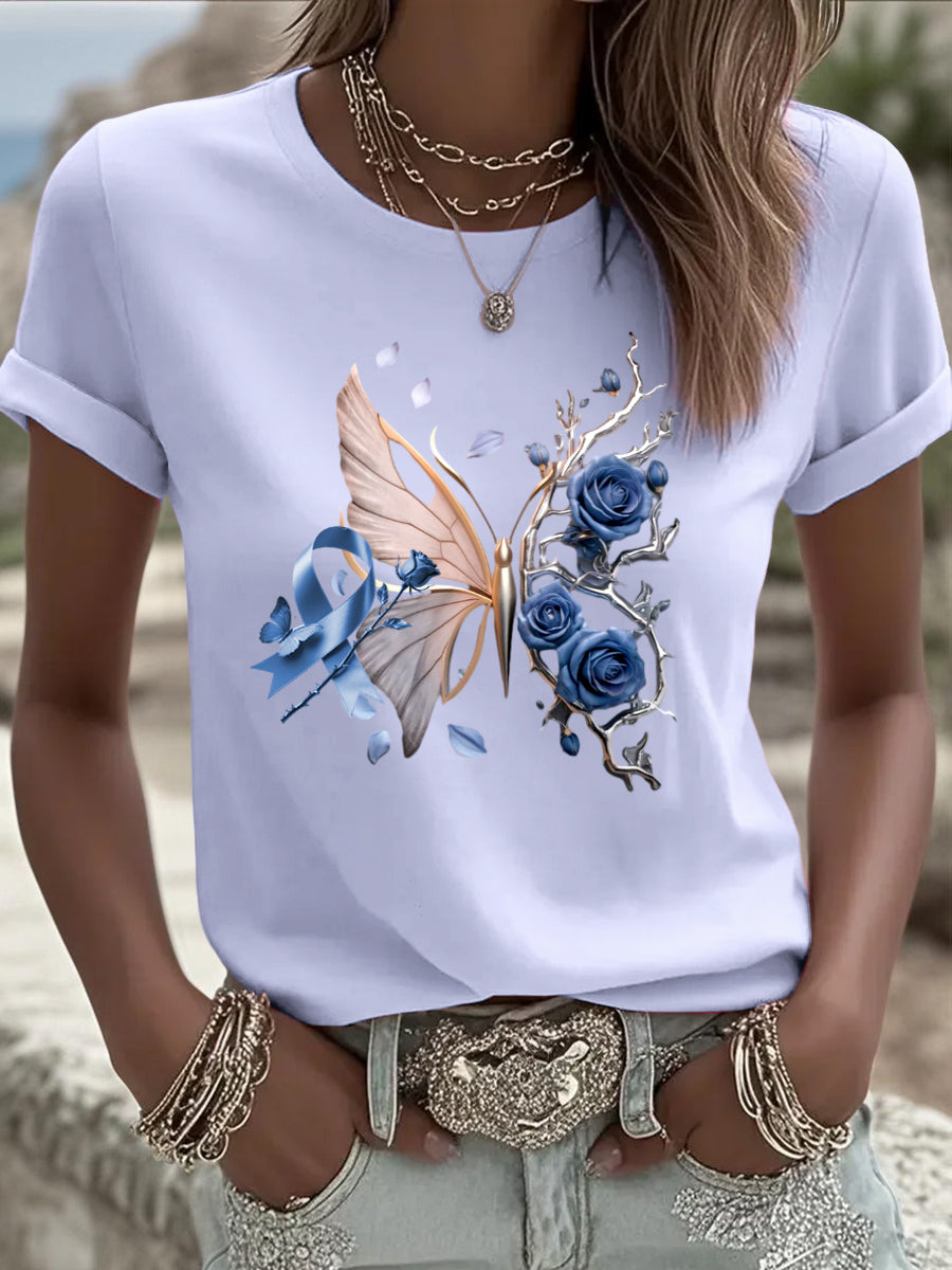 Dámské atmosférické a jednoduché motýl a stuha tištěné casual kolo krku s krátkými rukávy