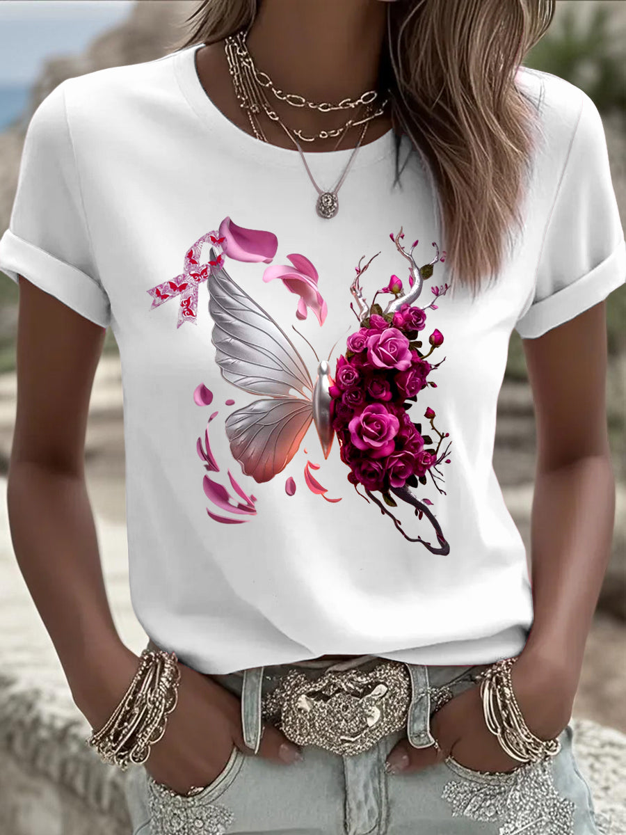 Dámské atmosférické a jednoduché růžové stuhy a motýlí tisk casual kolo krku s krátkými rukávy