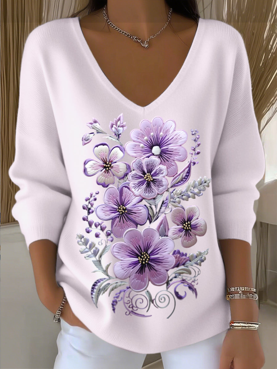 Dámské evropské styl světlé fialové v-neck svetr s nádhernou květinovou výšivkou módní a pohodlné vhodné pro každodenní nošení