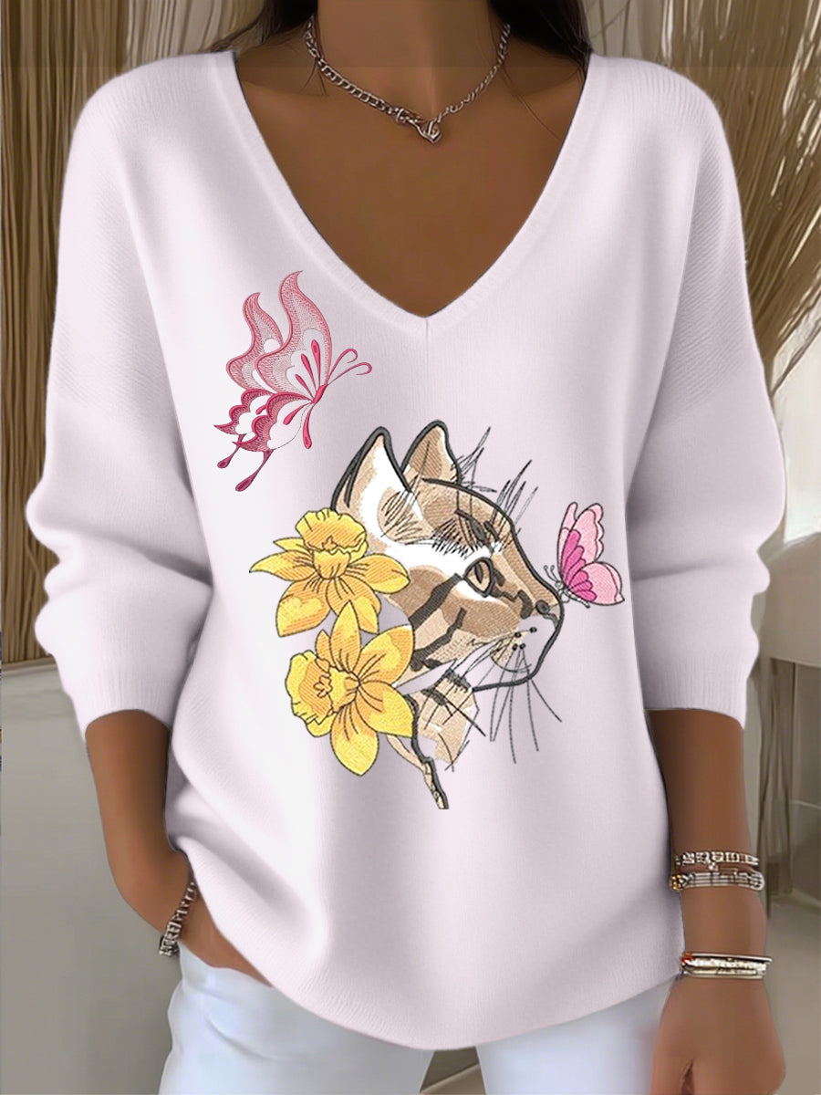 Dámské evropské styl světlé růžové v-neck svetr zdobený roztomilými kočkami a květinovou výšivkou jednoduchý a módní představující styl v každodenním oblečení