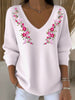 Dámské minimalistický bílý vneck svetr s růžovou červenou květinou a motýlem výšivky na vneck