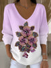 Dámské nádherné růžovébílé gradient vneck svetr s vynikajícím fialovým květinovým korálkem