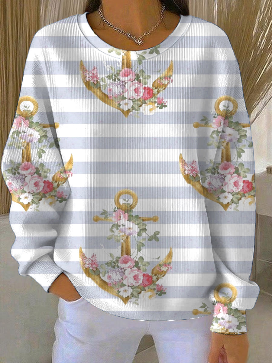 Dámské okouzlující modrobílá pruhovaná mikina s květinovou kotvicí otisky