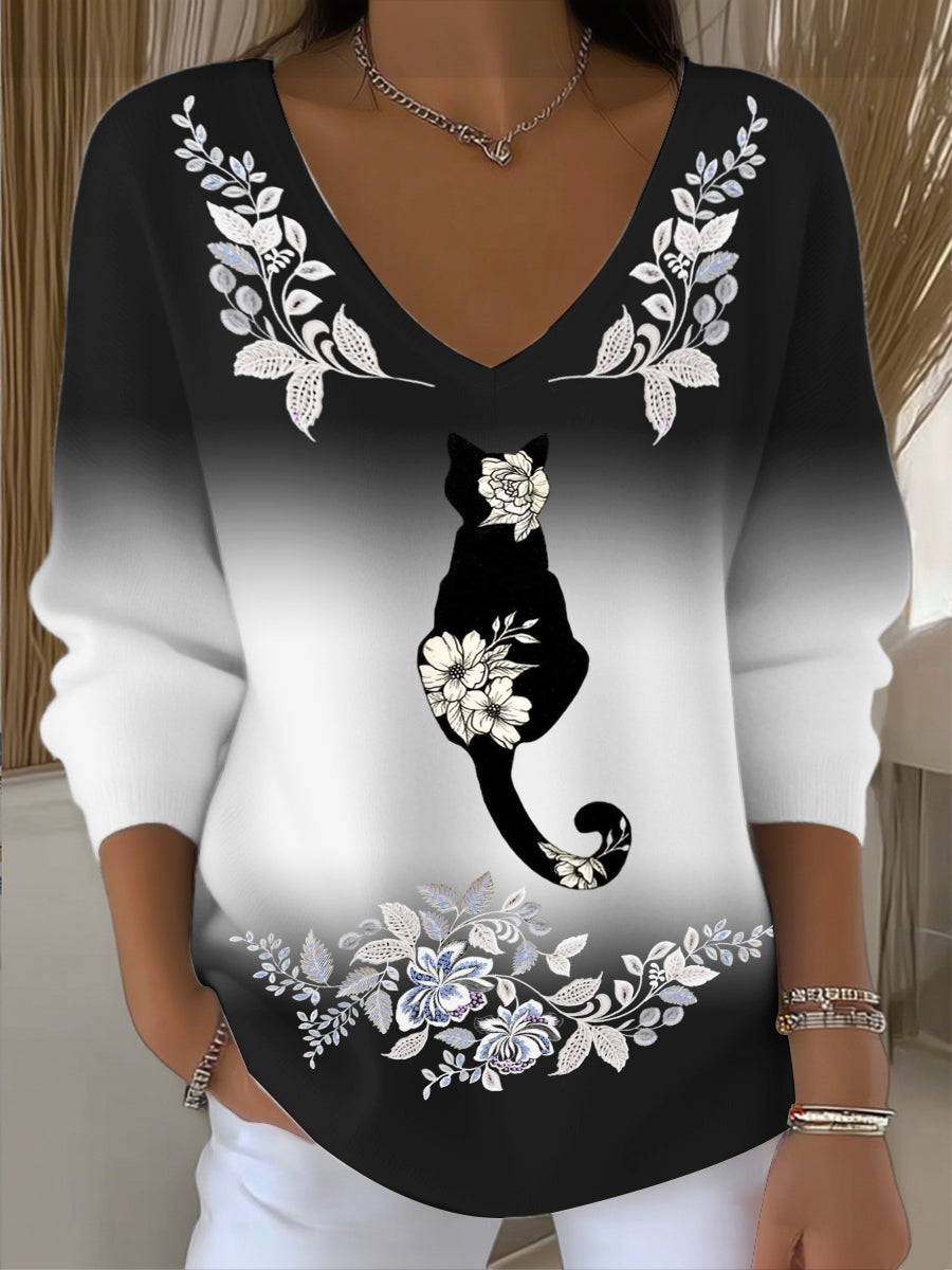 Dámské roztomilé černobílé gradient vneck svetr s květinovou kočičí tištěnou