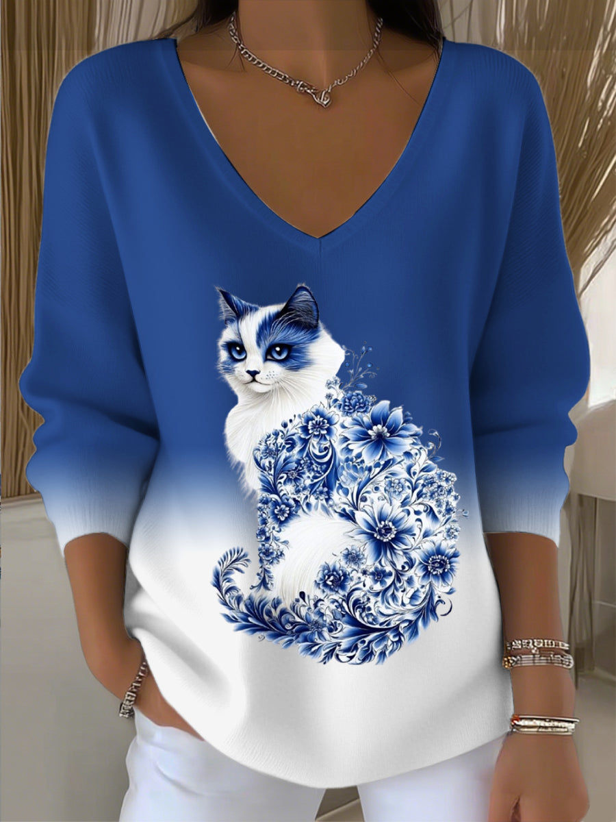 Dámské roztomilé modrobílé květinové kočky vkrk svetr