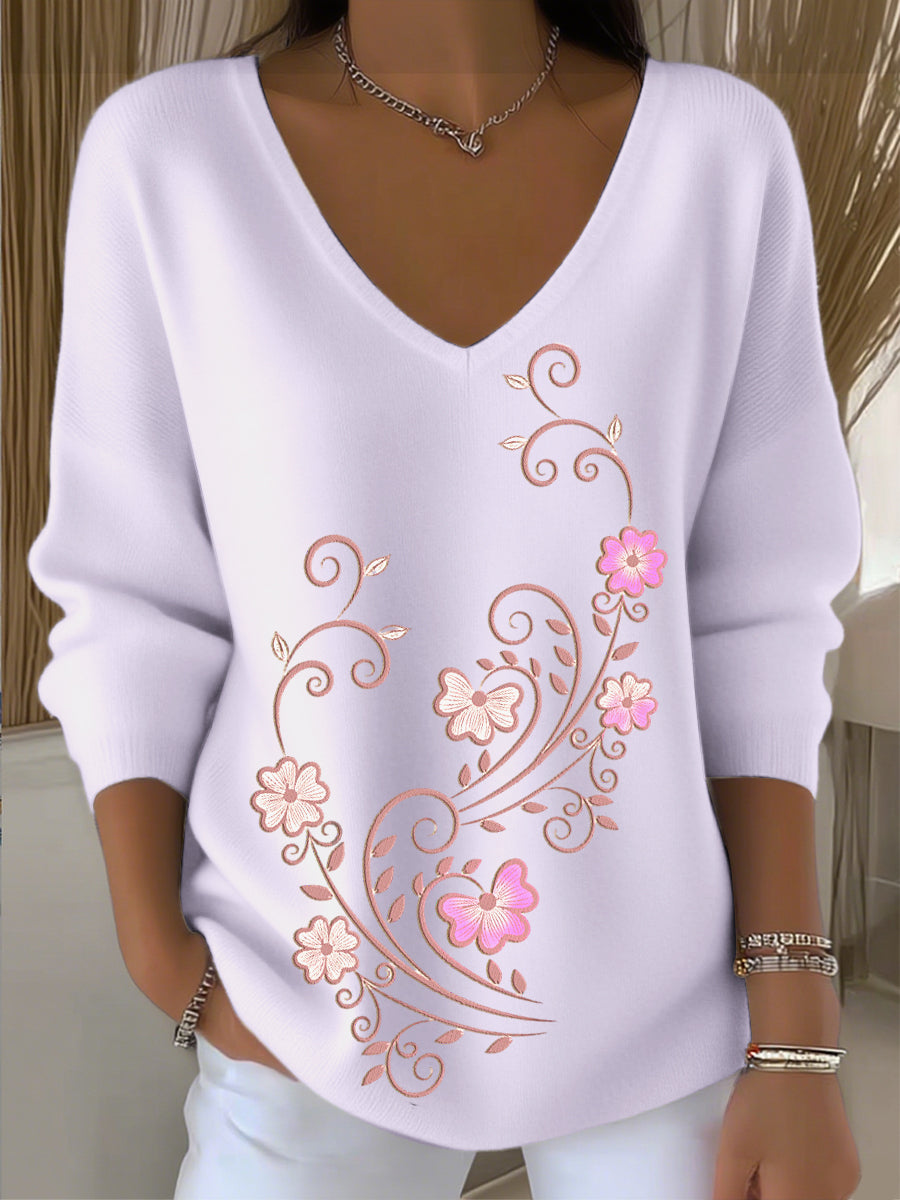 Dámské temperament růžové květinové výšivky v-krku svetr