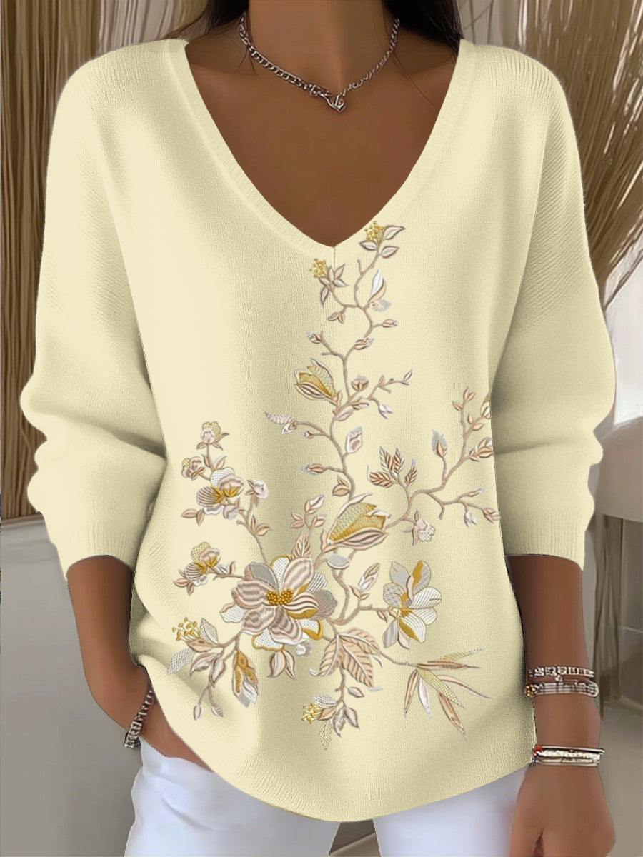 Dámské tráva žluté květinové výšivky v-krku svetr