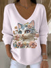 Dámský evropský styl světle růžový v-neck svetr spárovaný s roztomilou kočičí výšivkou módní a teplý vhodný pro každodenní potřeby nošení