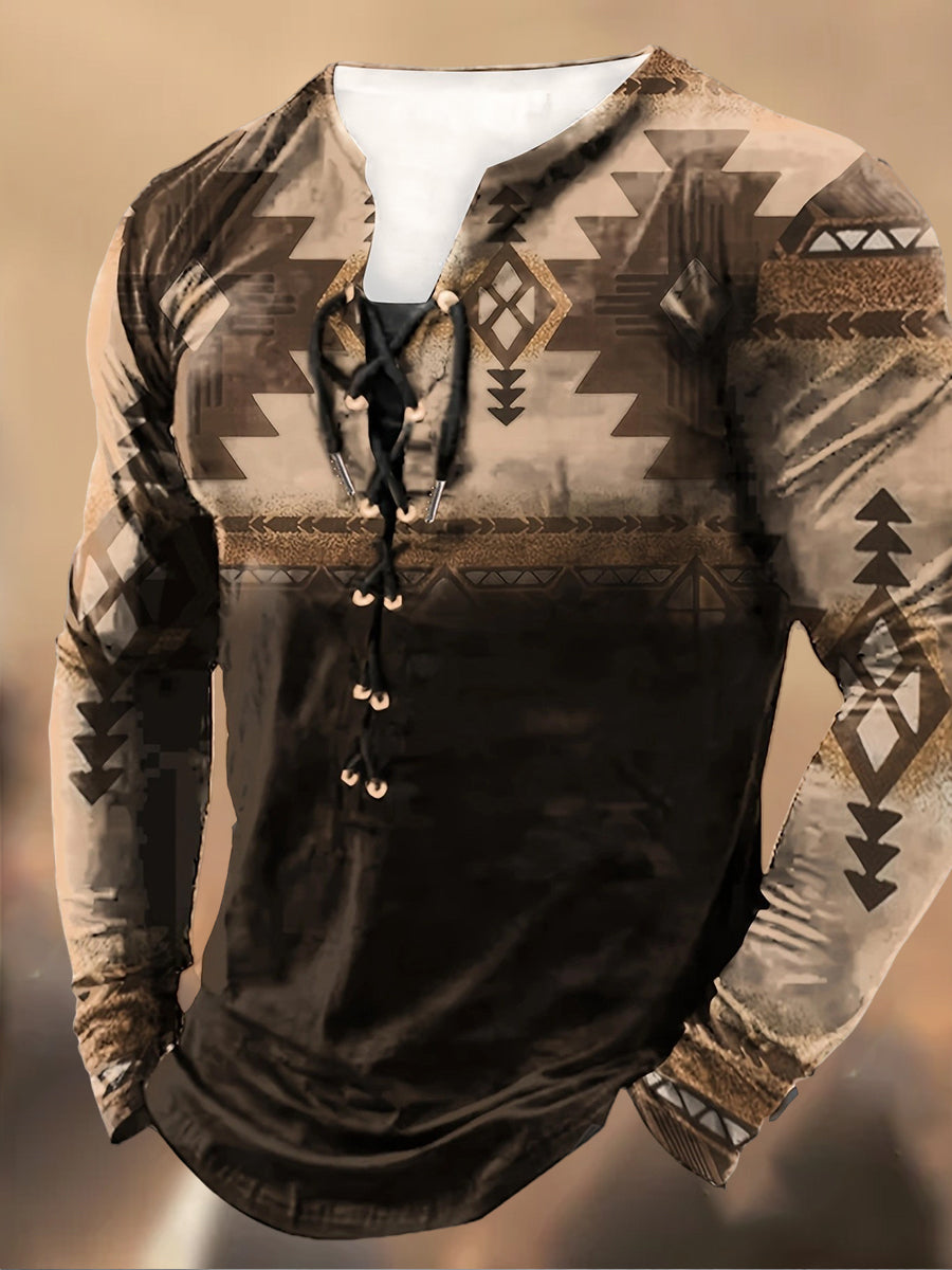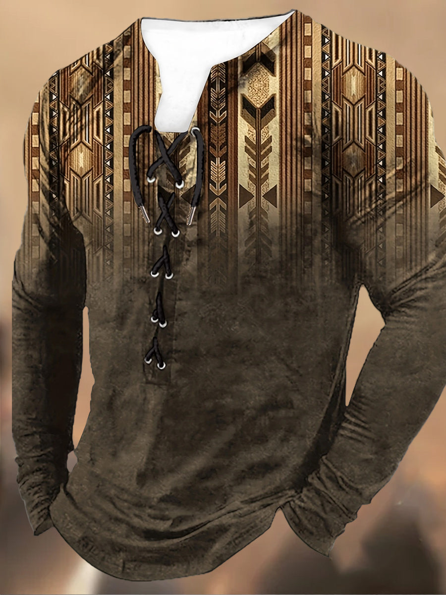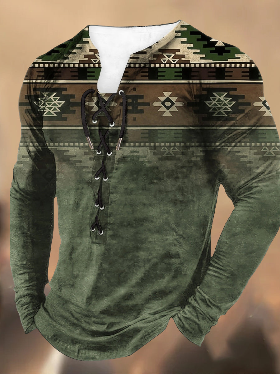 Pánské retro tisk laceup s kapucnou s dlouhými rukávy casual top