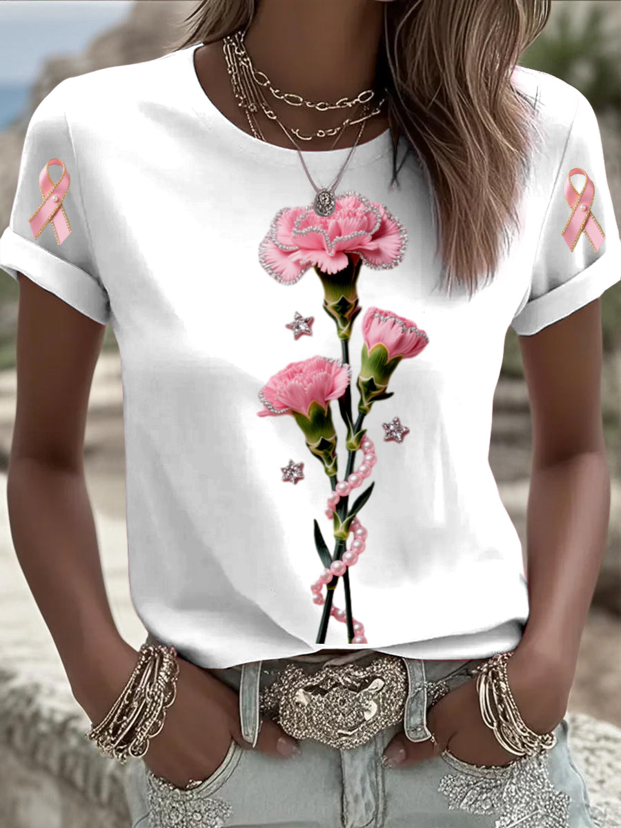 Retro rakovina prsu květinová hvězda perla tisk pohodlné neformální bavlněné t-shirt s krátkými rukávy