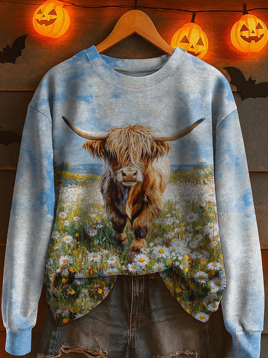 Vysočina kráva vytištěná volná mikina s dlouhým rukávem pod modrou oblohou