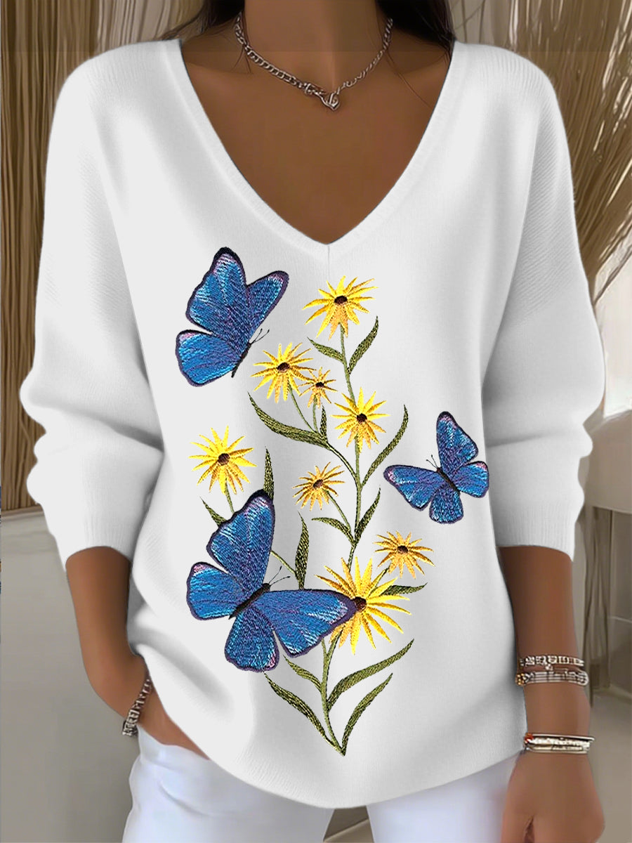 Ženský temperament velkorysý motýl a malé žluté květiny výšivky v-krku svetr